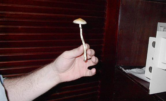 Back at the hotel room, Rhino holding the mushroom up for the camera. Notice the hotel safe he used as a makeshift glove box.